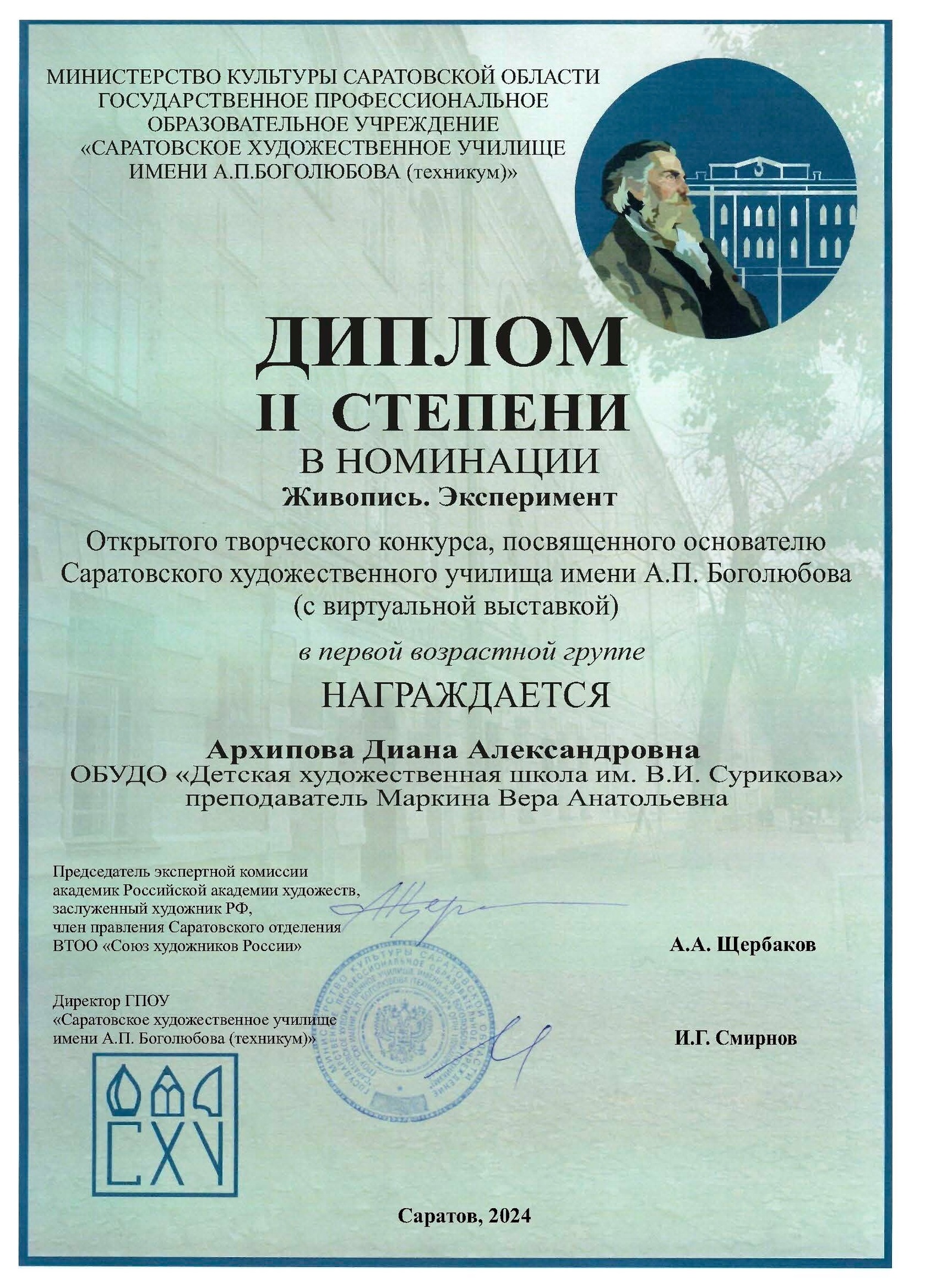 Поздравляем победителей Открытого творческого конкурса, посвященного основателю Саратовского художественного училища имени А.П. Боголюбова (с виртуальной выставкой), учредителем которого является министерство культуры Саратовской области, организатором – ГПОУ «Саратовское художественное училище имени А.П. Боголюбова (техникум)»