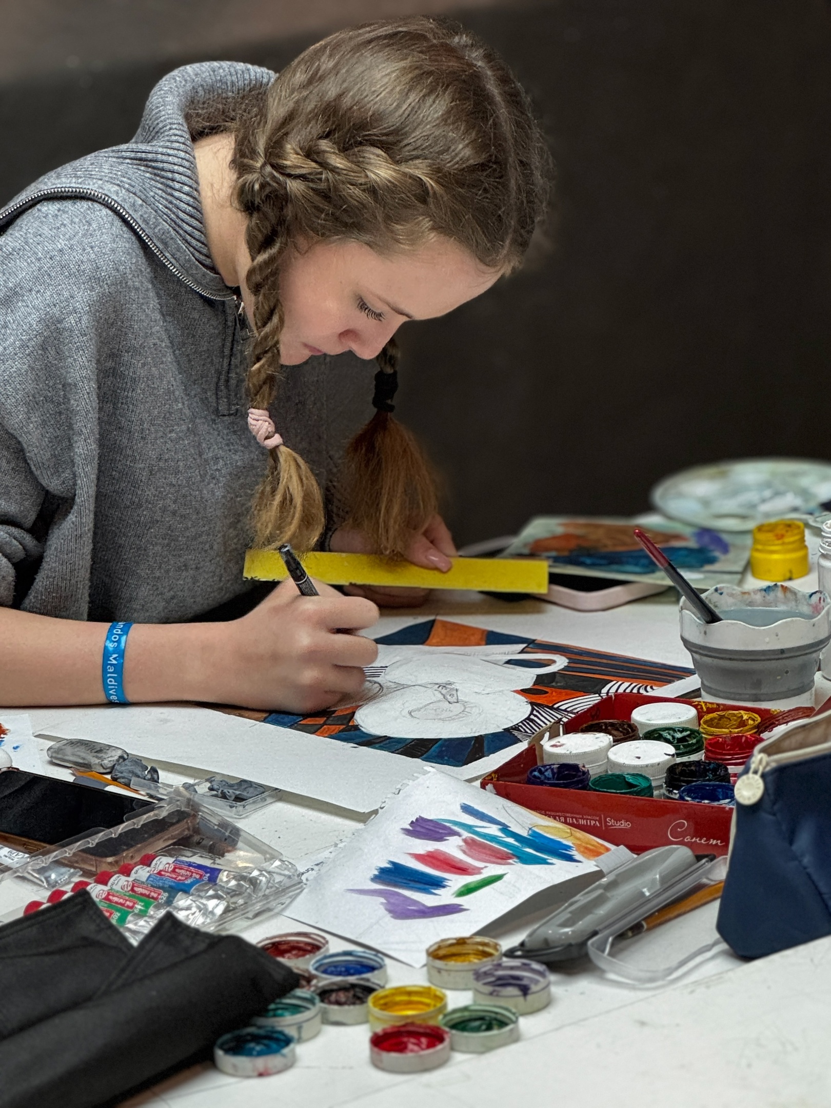 13 февраля было третье задание Международного конкурса Медный всадник, которое потребовало креативности мышления участников. Ученицы нашей школы рисовали в мастерской известной Питерской художницы акварелистки Татьяны Анисимовой. У нее выпущена линейка акварельных наборов по ее палитре. Очень рекомендуем.