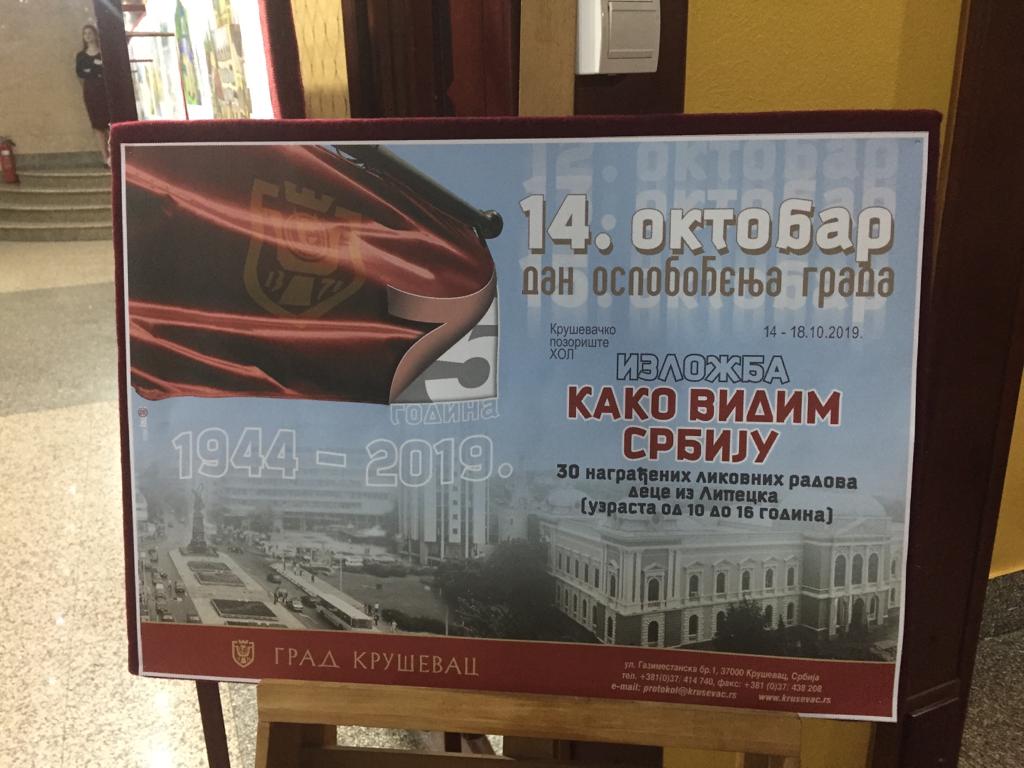 14 октября 2019 года в сербском городе Крушевац, побратиме г. Липецка, прошло открытие выставки победителей и участников Областного художественного конкурса детских рисунков «Я рисую Сербию». Выставка приурочена к торжественным мероприятиям, посвященным 75-летию освобождения города от фашистских захватчиков в 1944 году. В концертном зале г. Крушевац градоначальница Ясмина Полурович открыла выставку для посетителей форума.