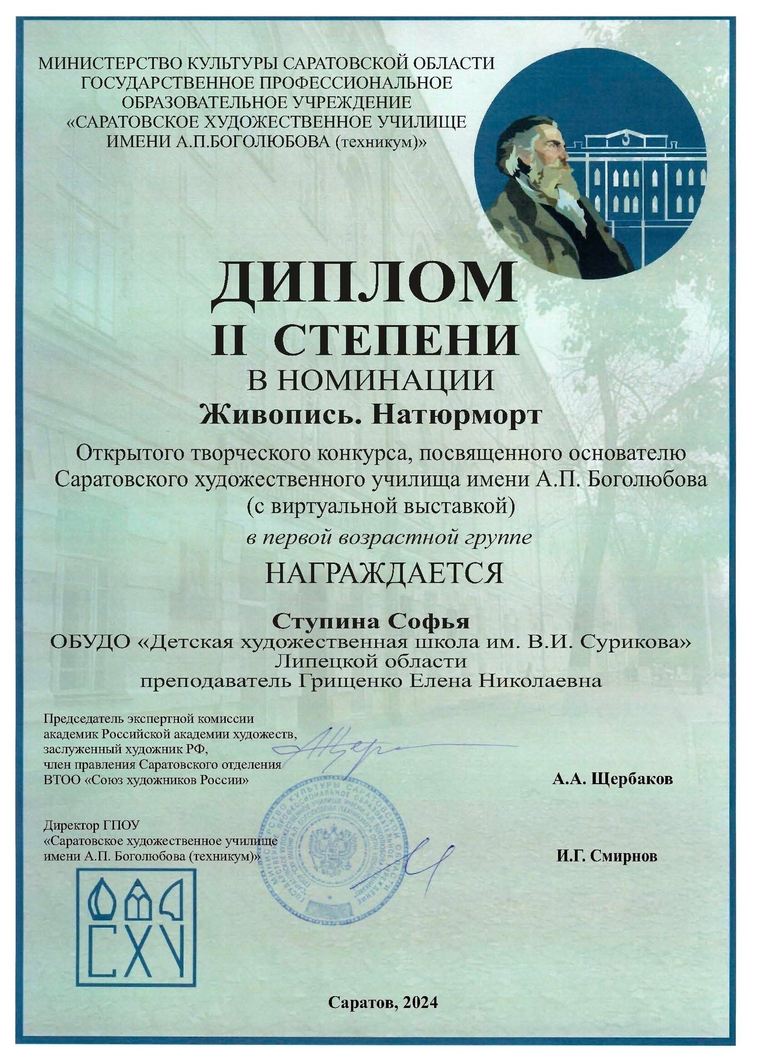 Поздравляем победителей Открытого творческого конкурса, посвященного основателю Саратовского художественного училища имени А.П. Боголюбова (с виртуальной выставкой), учредителем которого является министерство культуры Саратовской области, организатором – ГПОУ «Саратовское художественное училище имени А.П. Боголюбова (техникум)»