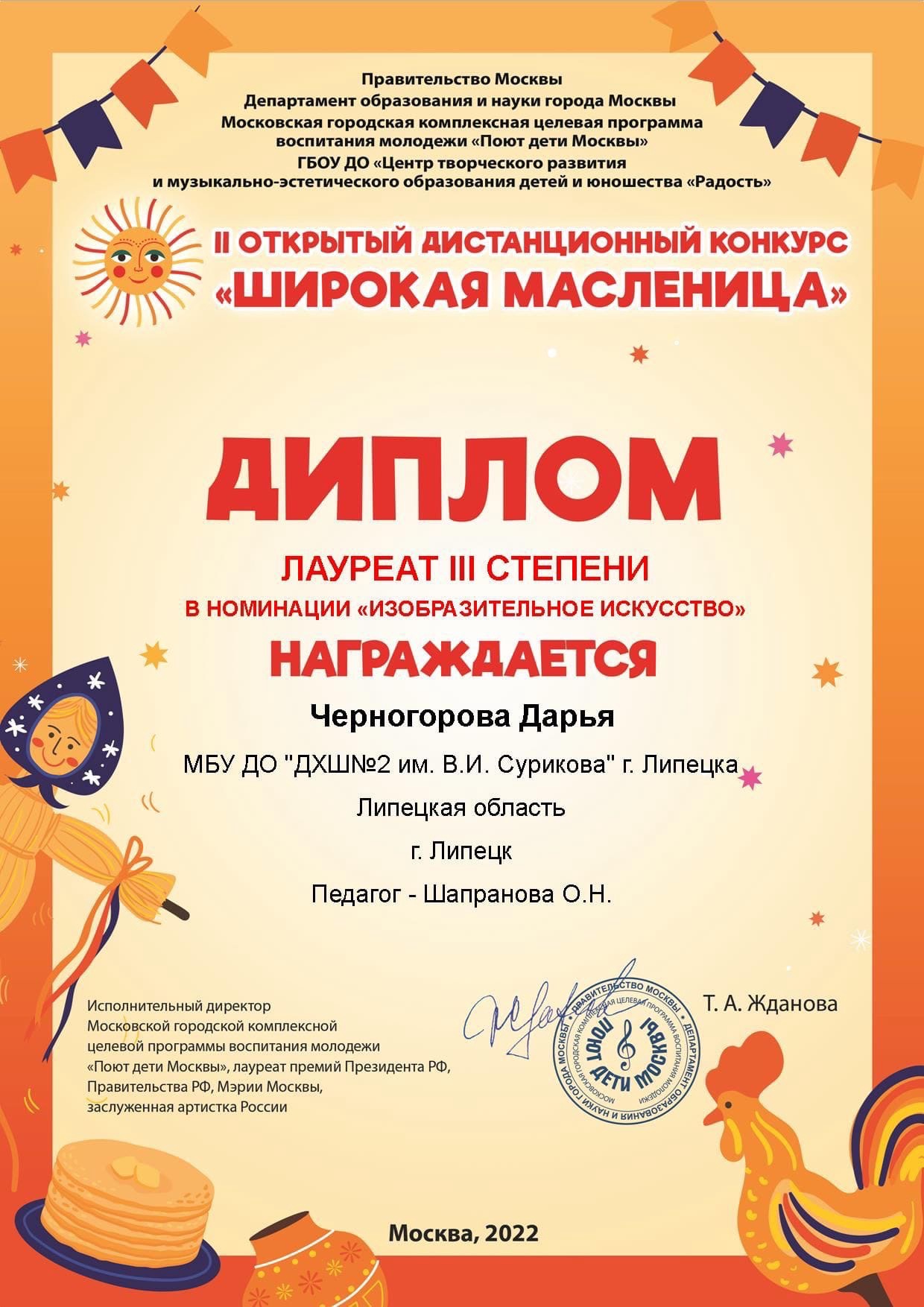 У нас замечательные новости! Подведены итоги Открытого Всероссийского конкурса «ШИРОКАЯ МАСЛЕНИЦА», который проводится при поддержке правительства Москвы и департамента образования и науки города Москвы.