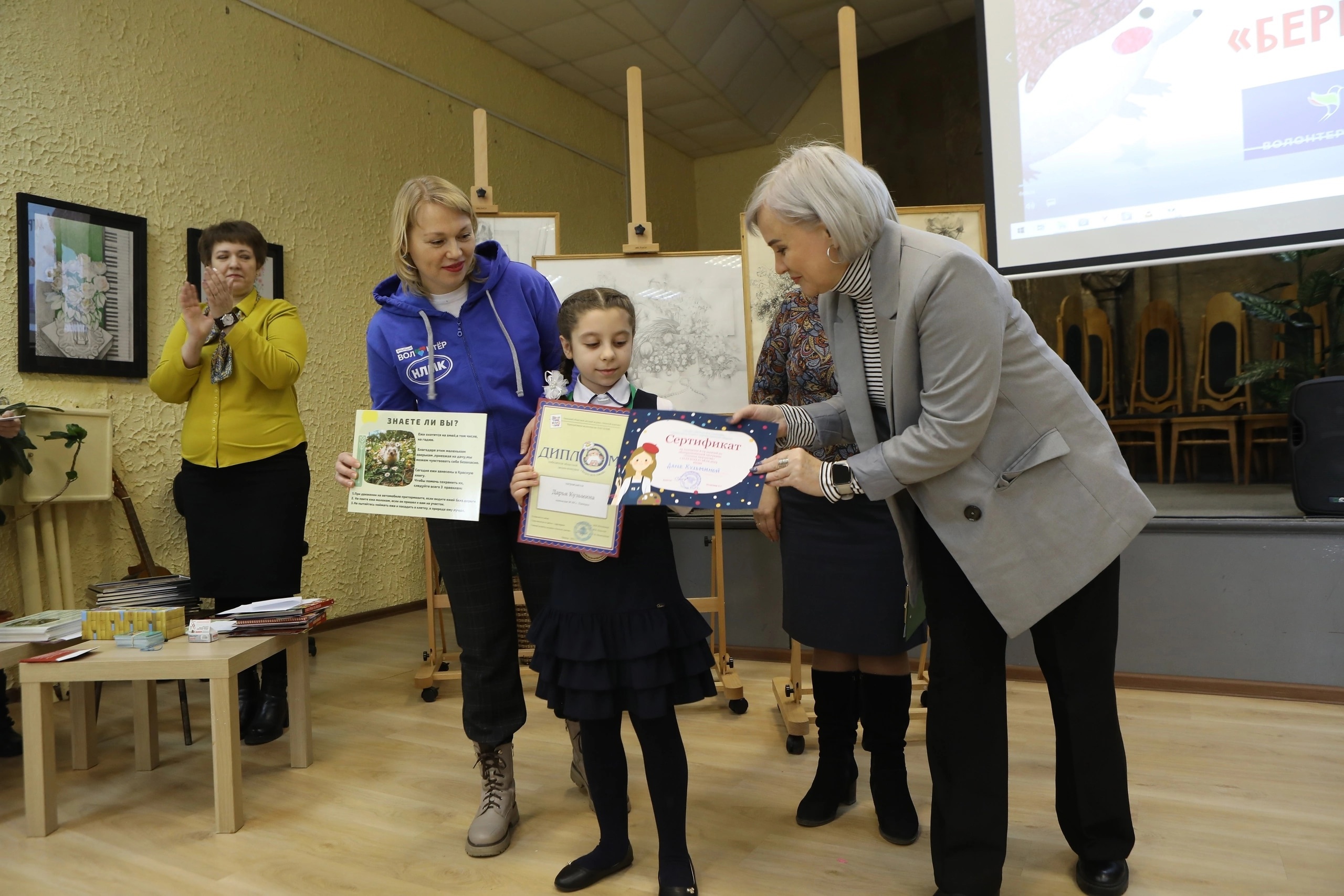 28 января в нашем зале состоялось чудесное событие- награждение победителей акции-конкурса «Берегите Ежей», автором которой являлись липчанка Маргарита Костенькова, трое её сыновей и детский журнал «Золотой ключик». Главный редактор Софья Милютинская  пригласила и  нашу школу принять участие в данной акции. Три ученицы 5 класса разрабатывали обложки и иллюстрации к одному из номеров детского журнала: Белоглазова Виктория, Барулина Мария и Чеховская Амелия.