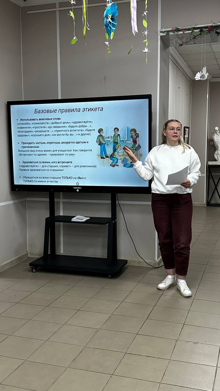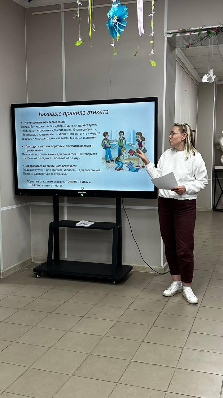 В холле школы учащимся была представлена презентация, содержащая все базовые общепринятые правила поведения и хорошего тона для детей и подростков. Ребята узнали, что такое этикет, чем знания этикета полезны для каждого и какие правила базового этикета существуют.